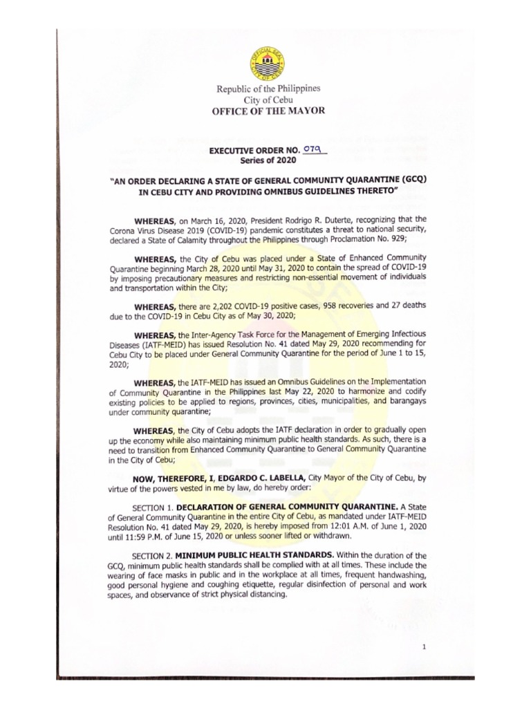 Minimum public health standards shall be complied with at all times for the duration of the gcq. Public transportation systems are suspended; Whereas, the iatf, through resolution no. 2020) dated 29 april 2020, approved and recommended the adoption of the omnibus guidelines for the This is the latest general community quarantine (gcq) guidelines released by the malacaƱang palace through the executive order no.